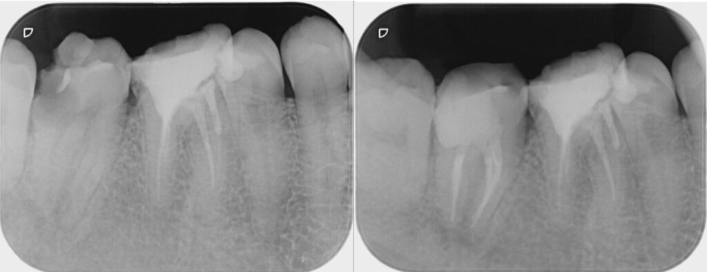 奥歯の痛みを主訴に来院されました。レントゲン検査にて奥歯に大きな虫歯が見つかり、神経が保存できる状態ではありませんでした。ご本人様は、歯を積極的に残したいとのことでしたので、専門医での神経治療をご提案しました。