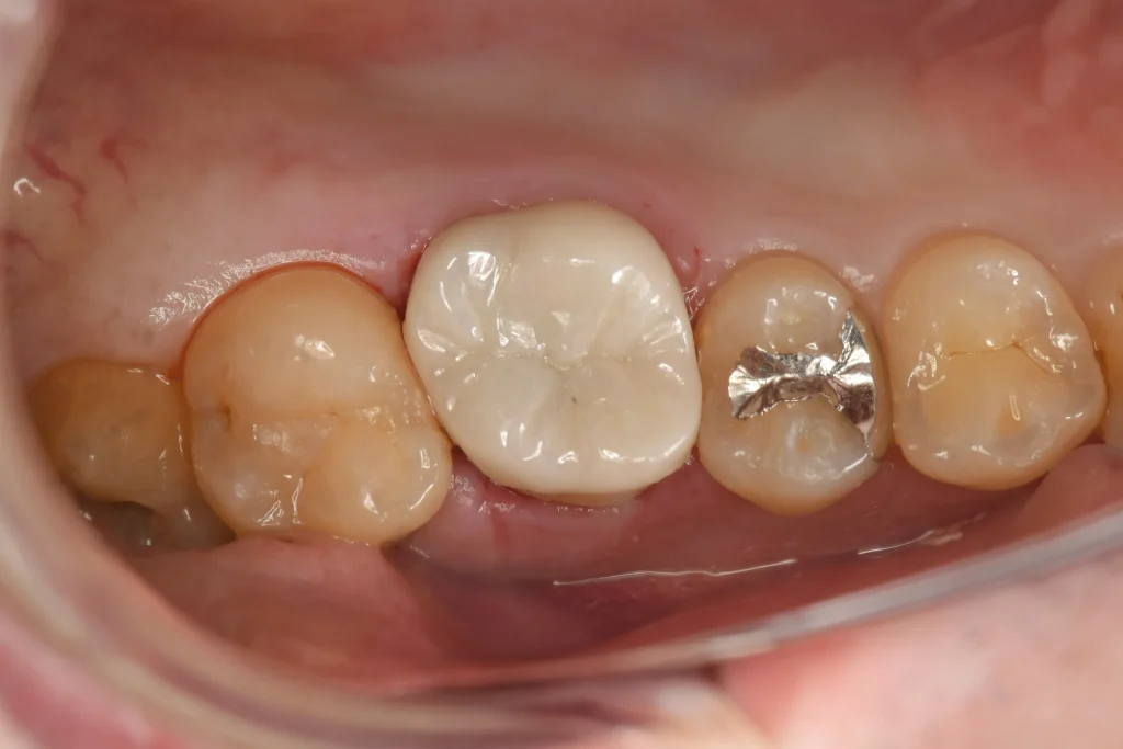 | 右上6番目の銀歯(保険治療のインレー)を外して虫歯を除去後、MTAセメントにて神経保護、その後被せ物をセラミックで行なった。 |