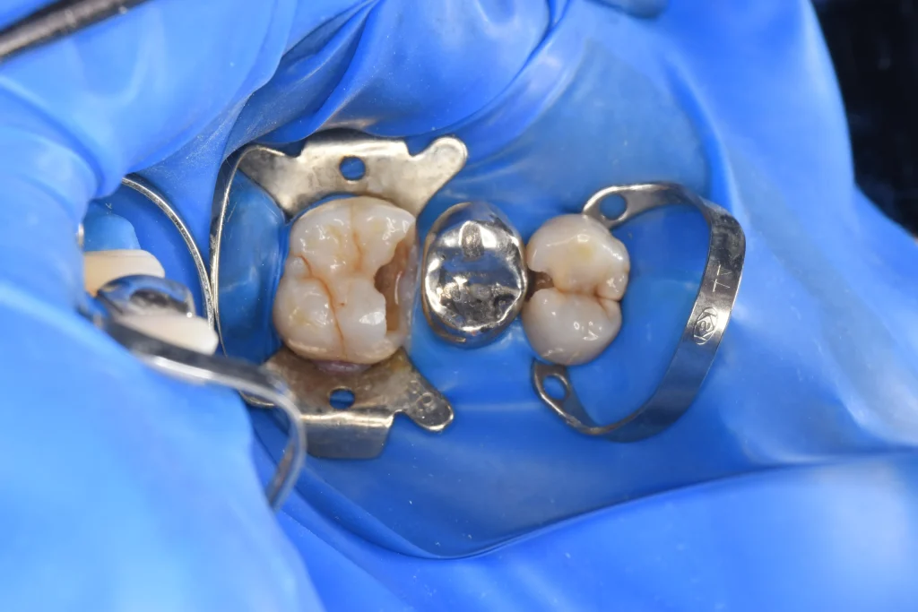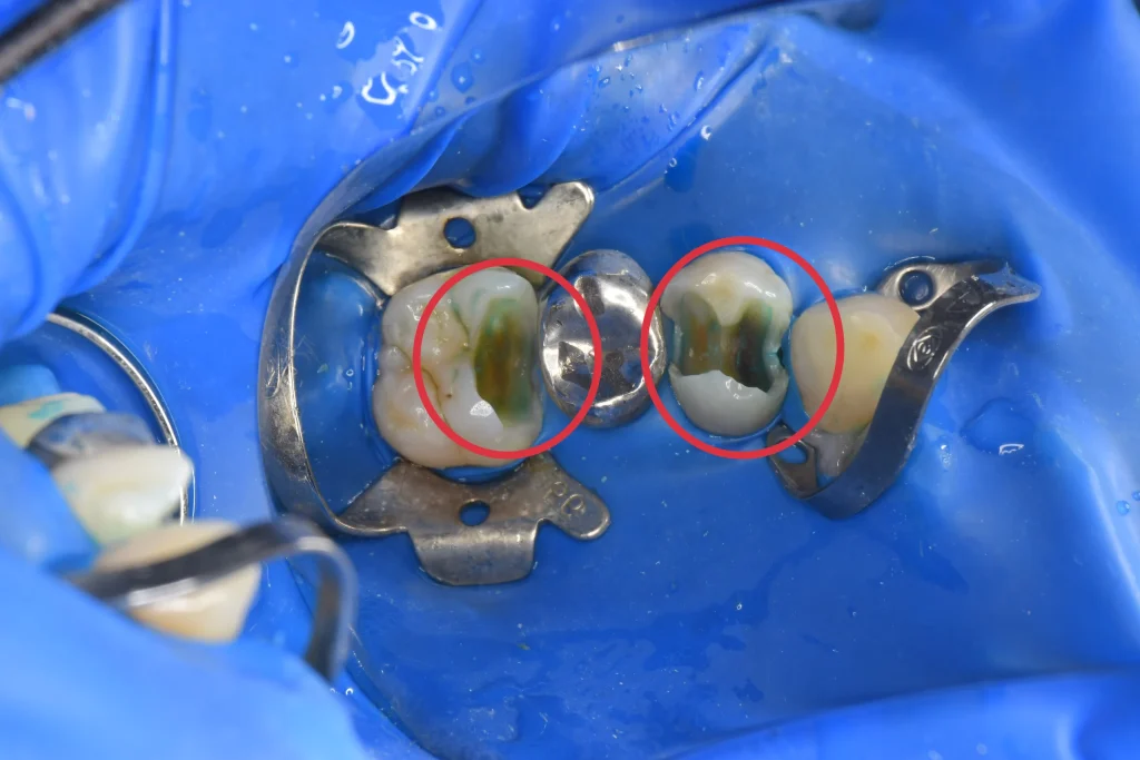 銀歯の前と後ろの歯に大きな穴が空いていることがわかります。患者様は痛みを感じていなかったこともあり、神経を保存する治療を行なっていきます。また、銀歯の下にも虫歯が認められるため、銀歯も一緒に処置をしていきます。
