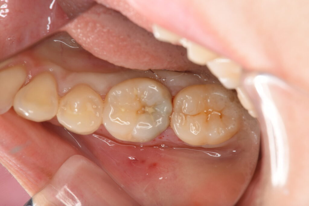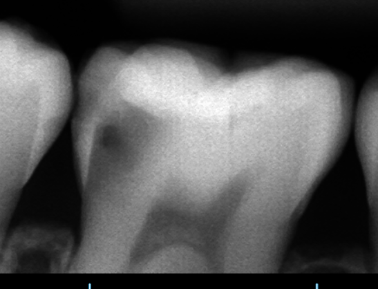 奥歯の痛みを主訴に来院されました。レントゲン検査にて神経近くまでの大きな虫歯が認められたため、MTAセメントによるVPT歯髄温存療法の選択肢とメリットデメリットを説明し、患者様はVPTを希望されました。