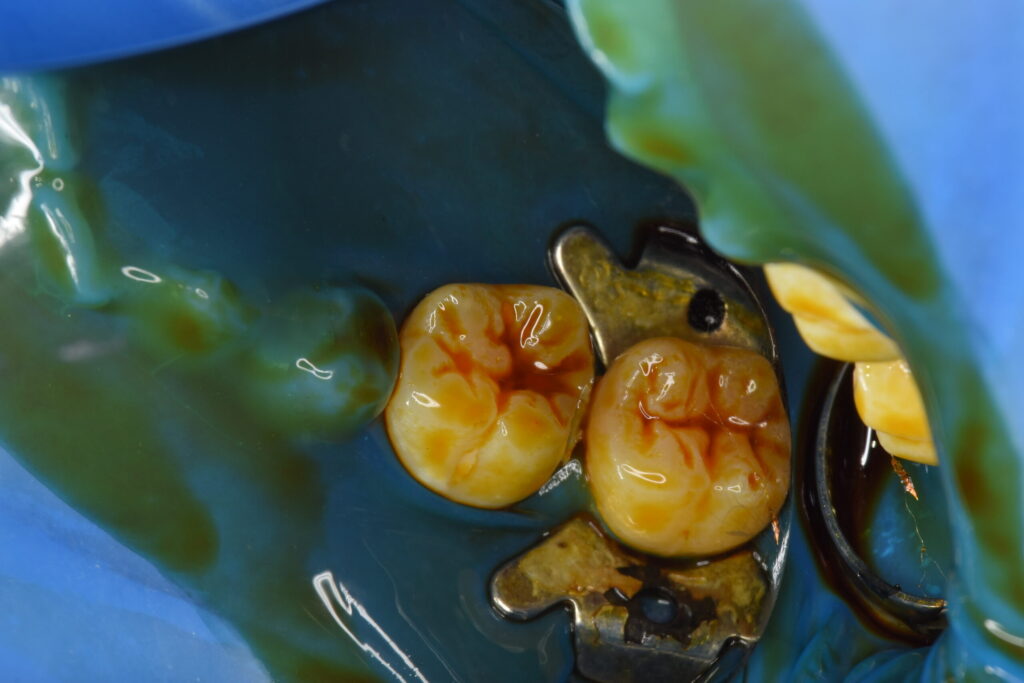 虫歯を除去する前に、ラバーダム防湿を行い清潔な状態を再現していきます。