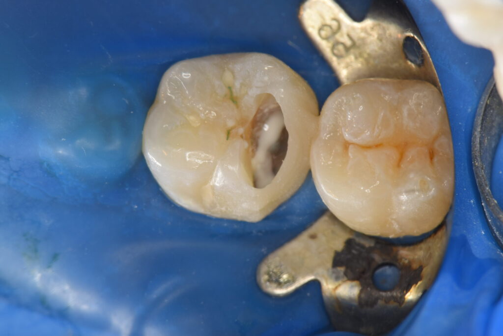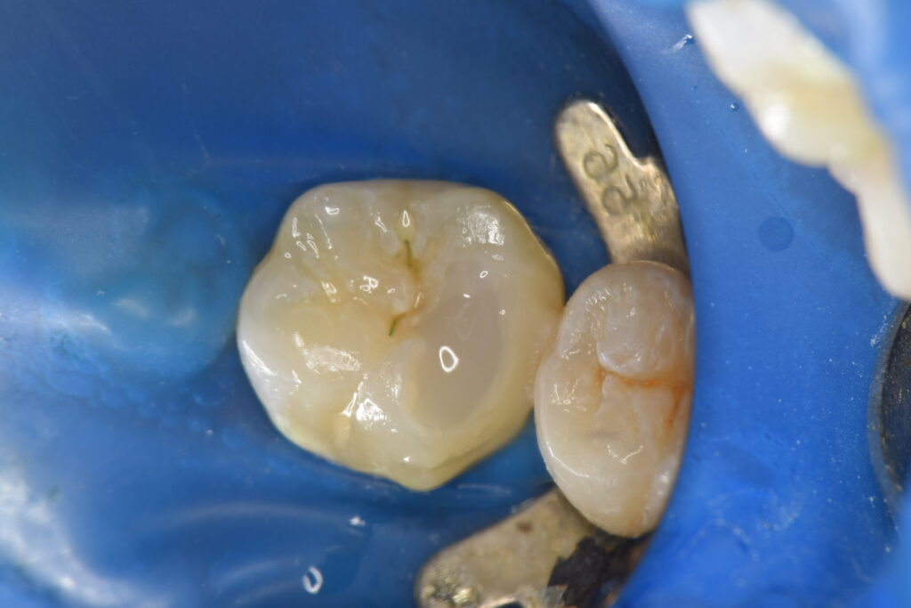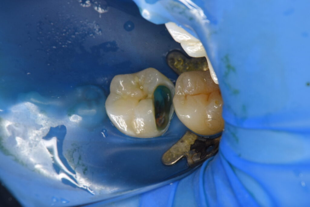 当日はレジンでの仮の蓋を行い、1ヶ月経過をみて痛みがないようでしたらオーバーレイでのセラミック治療を行なっていきます。(別記事にてその後の処置についてまとめてあります)