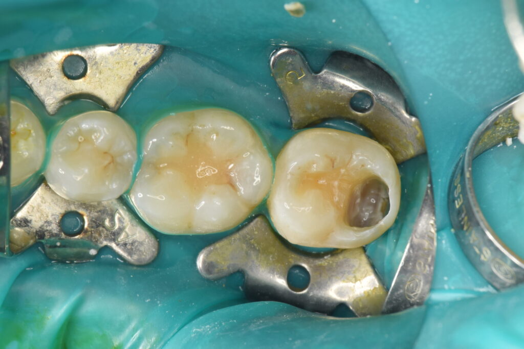 ラバーダム防湿を行い清潔な状態を確保し虫歯を少しずつ除去していきます。